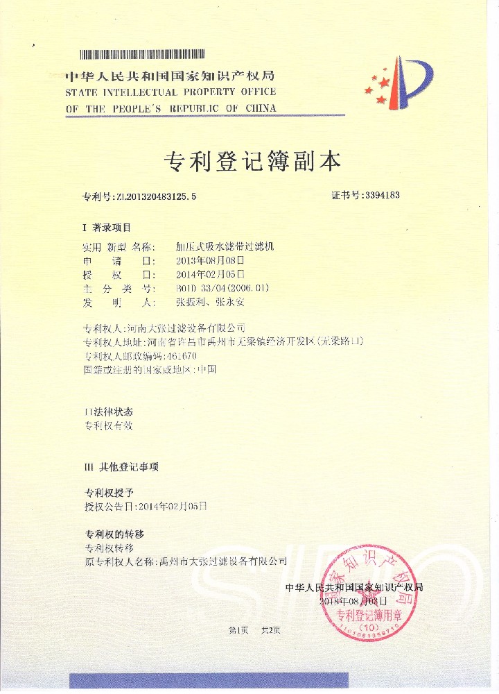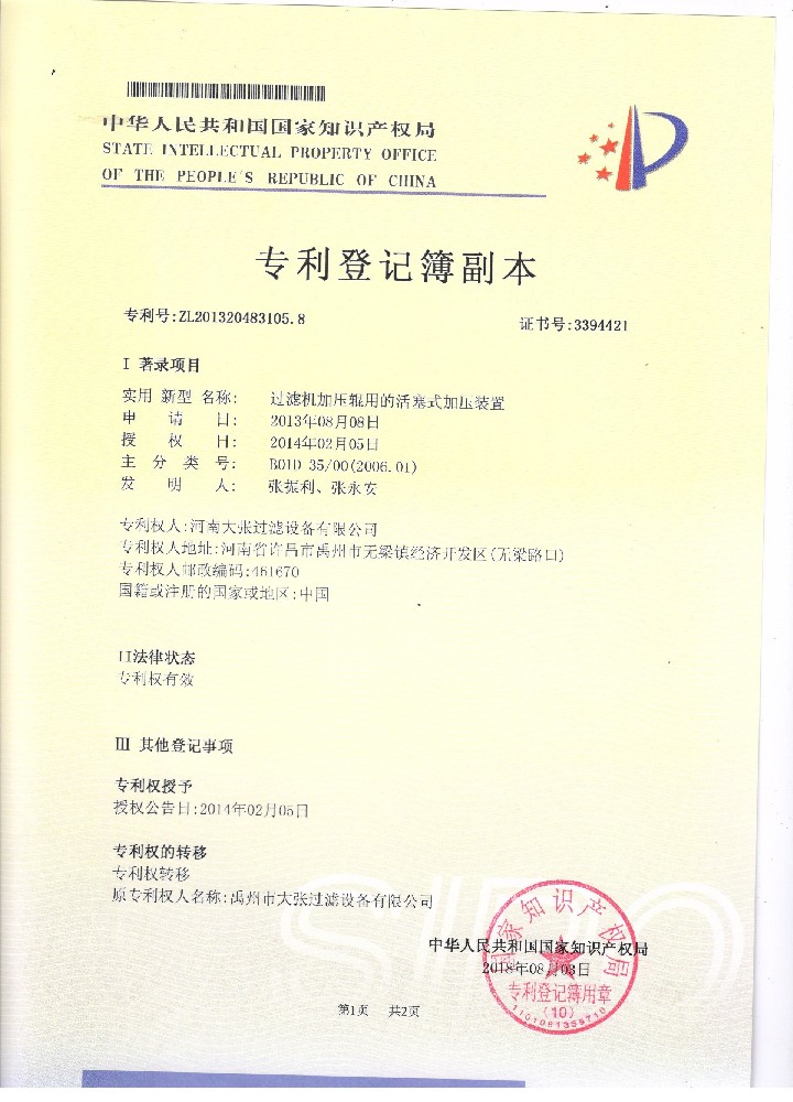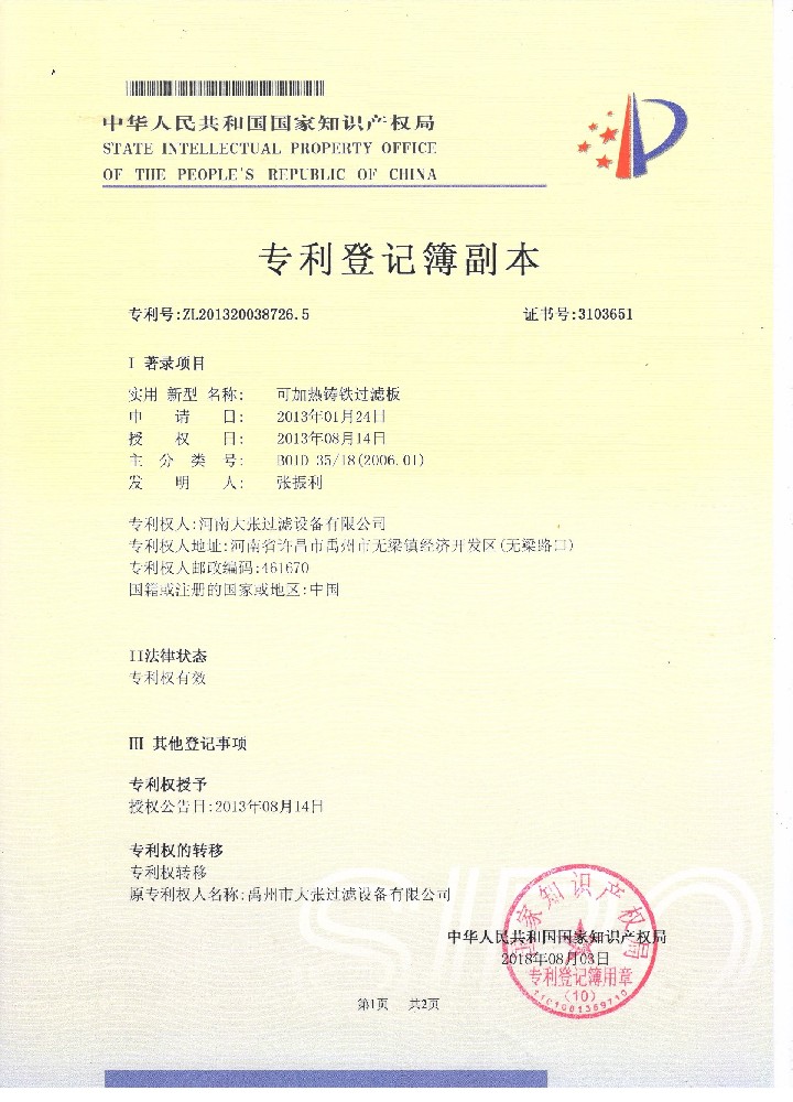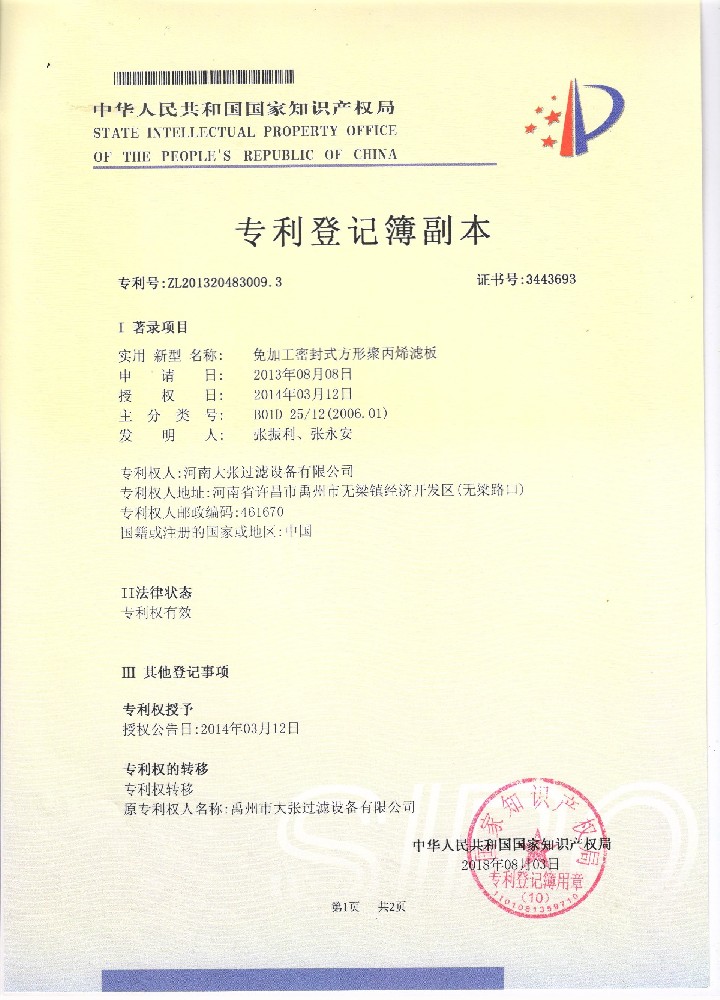 公司成功研發(fā)了免加工密封式方形聚丙烯濾板,并獲得發(fā)明專利,打破了中國免加工密封式方形聚丙烯濾板市場被歐洲壟斷的局面,產(chǎn)品進(jìn)入歐洲市場。